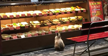 日本網友拍下這隻「觀望便當很久的貓」,當他站起來要點餐時我心都軟了!