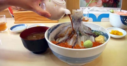 這隻在海鮮丼上的烏賊確實死了,但只要加一點醬油在上面…