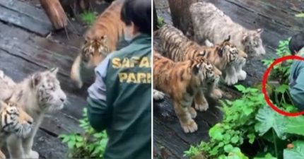 飼養員幫遊客撿手機「被4虎圍觀」!轉身後老虎反應融化網友:是幼兒園