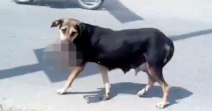 這隻狗狗被拍到口叼著一名小嬰兒在路上到處走,但放下後發現嬰兒已經…