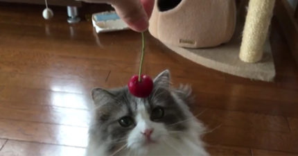 這隻喵星人正在用眼神說服主人給他吃櫻桃,下一秒他的超浪漫動作可能會讓你全身發熱想壞壞的事情…