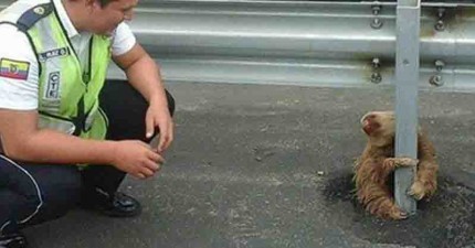 小樹懶想過馬路但無奈車速太快,嚇得抱緊他還以為是樹的護欄!他看到有人來救他時的萌樣讓人想要「抱緊處理」了!