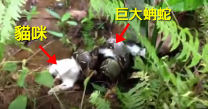 可憐的小貓咪被殘酷的巨蚺蛇纏住了,即將要被擠壓致死,好在有人終於出手相救!