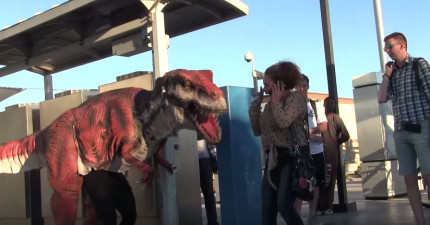 這些專心在走路的路人走到一半,一隻超逼真的恐龍就直接衝出來要咬他們!