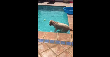 這隻狗狗不敢跳到泳池裡撿球,最後居然學會用人類的用具達成任務!