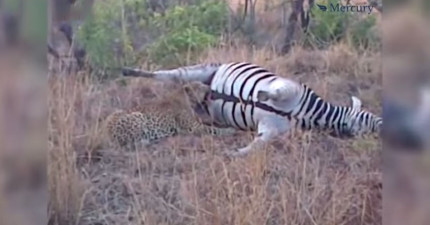 花豹在吃斑馬吃到一半,忽然斑馬顯靈體內噴出血泉,把花豹嚇跑!