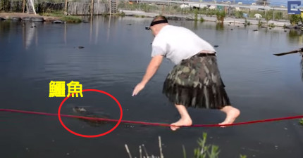 男子看到河裡有一隻鱷魚腿有點不對勁,結果他就走繩索然後跳到鱷魚身上!