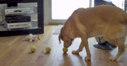 當這隻狗狗一口氣咬了3顆球並抬頭時,我飯都噴出來了。