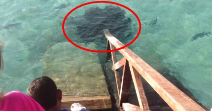 這條忽然從海裡跳出來的大魟魚給了在餵魚的遊客一個大驚喜。
