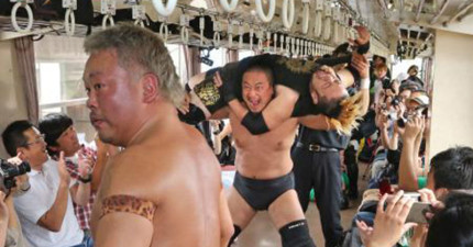 乘客在踏上日本電車後,立即目睹一場超近身的職業摔角翻摔…什麼鬼啦?!