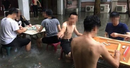 超大暴雨讓輔大全校停課,學生開心在系館外開台「泡水拼麻將」!