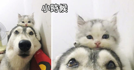喵星人從小就堅持「趴在月月頭上睡」,長大後一喵一汪「流露老夫老妻眼神」網笑炸!
