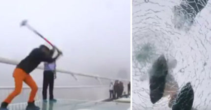 這名男子在中國張家界「世界上最長玻璃天橋」上當著其他遊客面前,拿出大槌子開始狂敲…