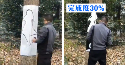 他「大樹包一張紙」讓人猜不透 畫到一半「樹幹消失」:成品太神!