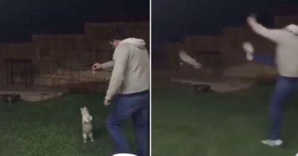 片中可惡男子「用食物欺騙貓咪」,用力一腳「踢過柵欄」網友憤怒! (非趣味)