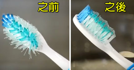 他把舊到都爆開的牙刷沾到了水裡後,竟然就變回跟新的一樣了?!