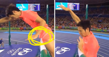 就在這位奧運撐竿跳選手從空中落下時「GG太大整個被勾起」,金牌就這樣飛了!