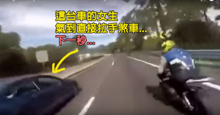 因為男子硬要跟一旁的機車軋車,女友氣到在超高速下全力拉手煞車…