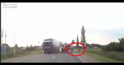 當兩台大卡車相撞時,兩個旁邊的單車騎士看起來100%死定了,但…