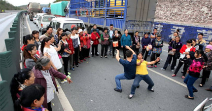 中國一起車禍造成車潮動彈不得,乘客竟下車開始「鬥舞」!拍下的影片太精采了!