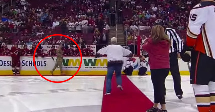 冰球賽請了這對夫婦來看球賽,但在開球儀式時從遠處看到的景象讓他們都失去了控制!