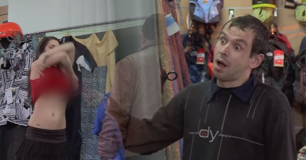 辣妹在更衣室前突然在男生面前把衣服脫掉。當兩顆球掉到地上時男生的眼睛也掉出來了!
