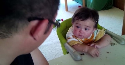 這位滿臉飯粒的寶寶很專心想要聽爸爸的教訓,但同時卻完全敵不過強勢來襲的睡魔。到最後爸爸都受不了笑出來了!