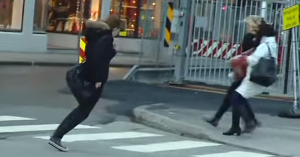 挪威這場最強烈的颱風,讓影片拍下的所有行人看起來像是在學麥可傑克森的月球漫步。