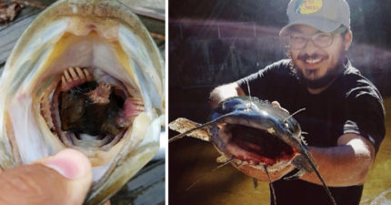 他在池塘釣到大鱸魚,開心取魚鉤時發現「雙手撐嘴想爬出來的小動物」!