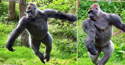 大猩猩被拍到在炫耀自己會跳「芭蕾舞」,在空中雙腳的「輕飄美姿」連員工都傻眼!