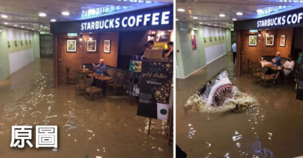 超淡定老伯在淹水的星巴克「悠哉看報紙」,不知道網路險惡「下一秒被P到爆」!