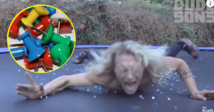 他在跳床上「灑滿圖釘」然後飛撲上去,他站起來時我的胸口也痛到開始流血了…