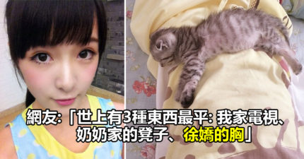 藝人徐嬌分享貓咪趴睡照被網友酸「胸部太平」,她馬上用這張自製圖霸氣反攻到網友改口說「萌妹都平胸」!