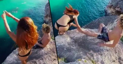 女子在懸崖旁失去平衡想要抓住男友腳,但男子在那瞬間踢開讓鄉民們罵爆了!(影片)