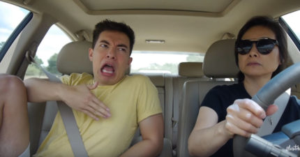 右邊表情超嚴肅媽媽開車,當音樂開始時兒子的「應該得奧斯卡」爆笑表演會讓你笑到流血淚!
