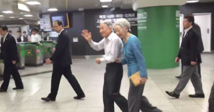 日本網友拍到天皇與夫人搭地鐵的影片,當天皇走過後一看後面…那保鏢規模讓路人嚇到趕快退兩步!